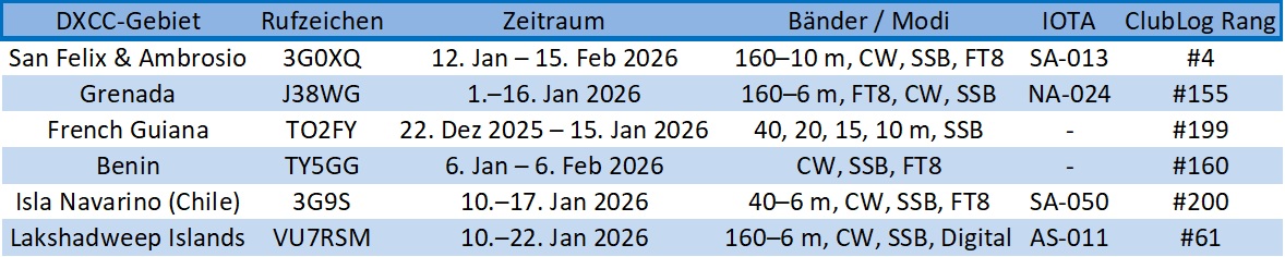 Im Folgenden einige handverlesene DXpeditionen im Januar 2026: