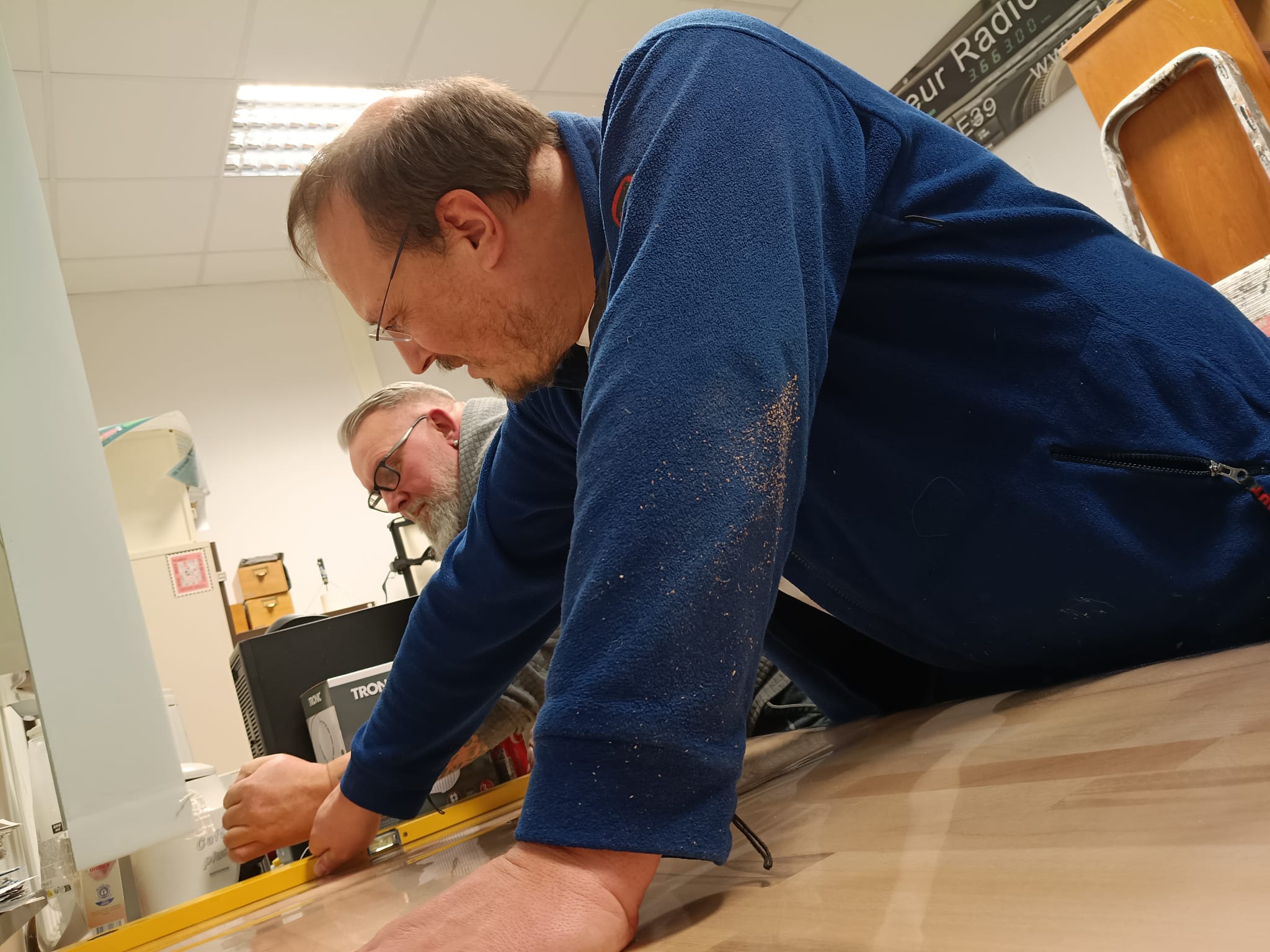 Das bisher genutzte QSL-Kartenregal sowie die alten Stühle wichen einer großzügigen, stabilen Arbeitsfläche für handwerkliche und technische Tätigkeiten. Auf dieser neuen Arbeitsfläche finden nun unter anderem eine Tischbohrmaschine sowie ein 3D-Drucker ihren festen Platz. Damit stehen dem OV künftig deutlich erweiterte Möglichkeiten für Reparaturen, Eigenbauprojekte und experimentelle Entwicklungen zur Verfügung.