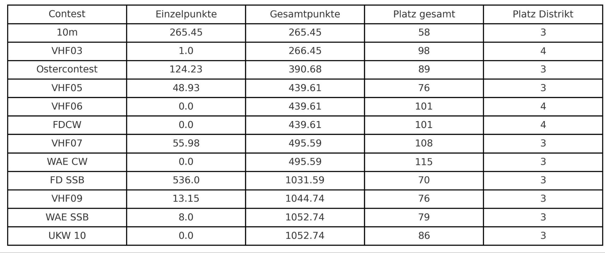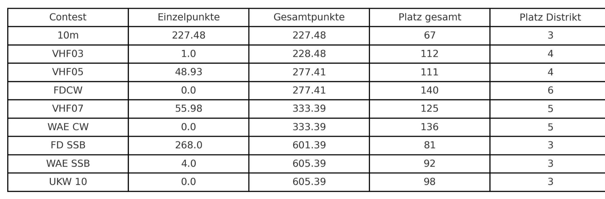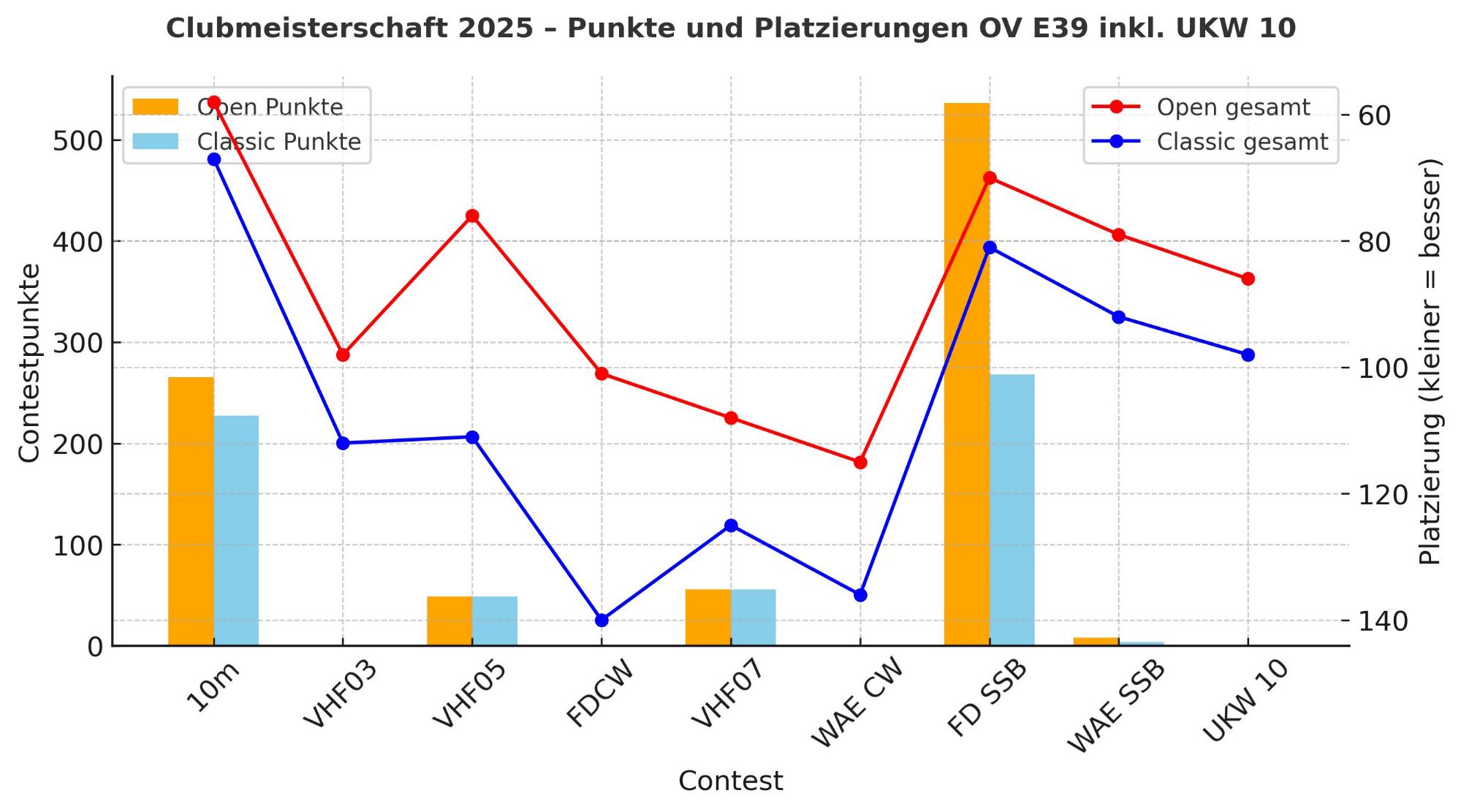 Der fehlende Beitrag beim UKW 10 Contest ist zwar ein kleiner Rückschlag, dennoch bleibt der OV E39 in beiden Wertungen fest in den Top 3 des Distrikts E verankert. Mit den verbleibenden Herbst- und Wintercontesten bestehen weiterhin gute Chancen, die bundesweiten Platzierungen noch zu verbessern.