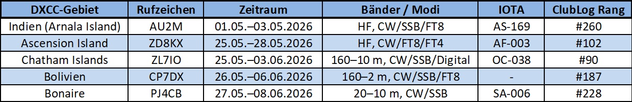 Der Mai 2026 bietet eine solide Auswahl bestätigter DXpeditionen, insbesondere zum Monatsende hin. Mit den Chatham Islands und Ascension Island sind auch zwei deutlich begehrte Ziele vertreten, während Arnala Island vor allem für IOTA-Interessierte spannend ist.