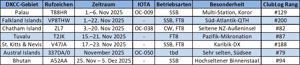 Übersicht der ausgewählten DXpeditionen im November 2025