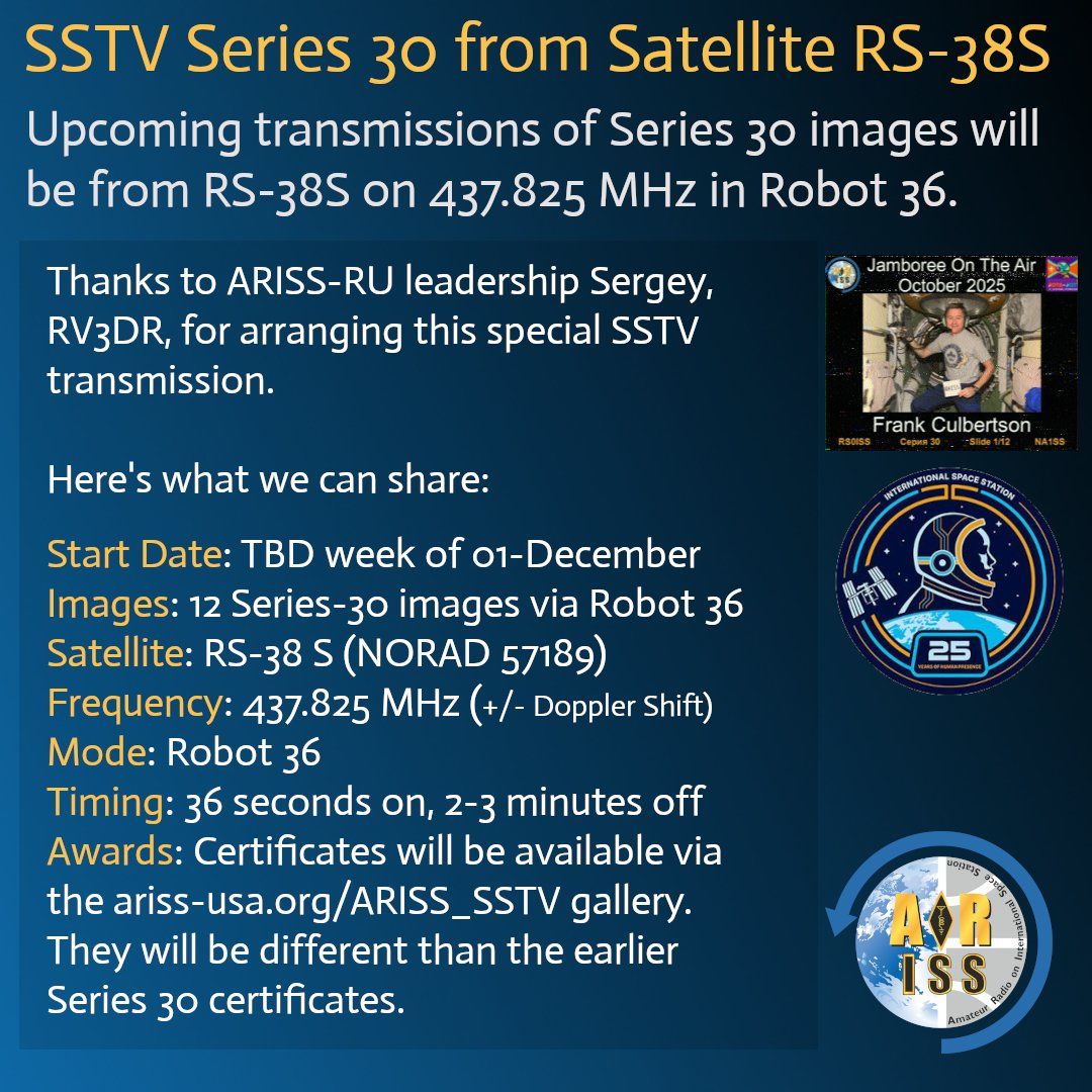 ARISS-RU hat eine Sonderaktion für alle SSTV-Interessierten angekündigt: Die zuletzt wegen einer technischen Panne von der ISS nicht übertragenen Series-30-Motivbilder werden erneut ausgesendet – nicht von der ISS, sondern vom Satelliten Vizard-Meteo.